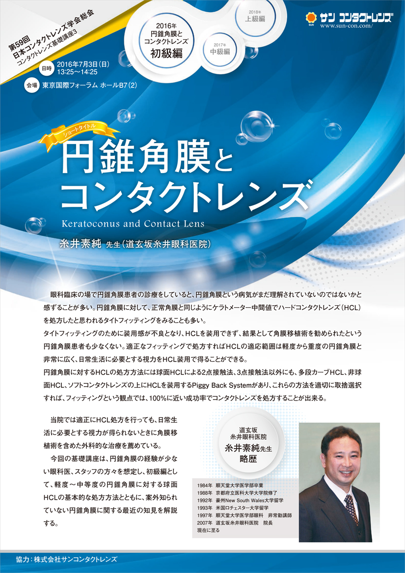 講師に糸井素純先生を迎えて『円錐角膜とコンタクトレンズ』に関してご講演いただきます。